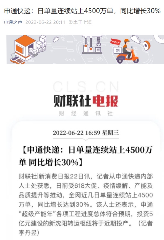 6月23日消息,“申通之声”公众号转发媒体报道称,据申通快递内部人士消息,日前受618大促、疫情缓解、产能及品质提升等推动,全网近几日单量连续站上4500万单,同比增长达到30%,增幅保持领先。同时,时效质量也稳步提升,全链路时效环比优化超3个小时。