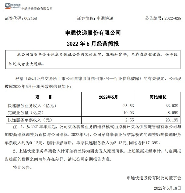 根据申通快递近日发布的2022年5月经营简报,该公司今年5月份快递服务业务收入25.53亿元,同比增长33.03%;完成业务量10.03亿票,同比增长8.09%;快递服务单票收入2.55元,同比增长23.19%。同一时间段,韵达业务量14.85亿票,圆通业务量15.54亿票。