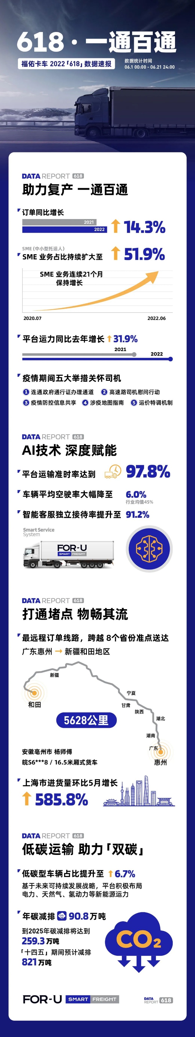 6月23日消息,福佑卡车公布“618”期间业绩报告。数据显示,今年“618”期间(6月1日至21日),福佑卡车平台订单量同比去年增长14.3%,司机数量同比增长31.9%。SME(中小型托运人)业务占比扩大至51.9%,该业务自上线以来连续21个月保持增长。