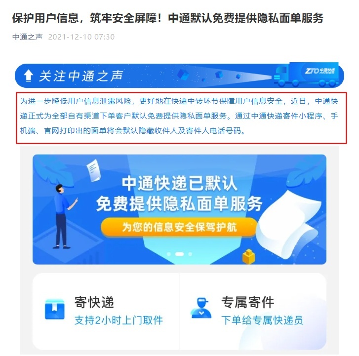 值得一提的是,2021年12月,“中通之声”发布消息称,中通快递正式为全部自有渠道下单客户默认免费提供隐私面单服务。通过中通快递寄件小程序、手机端、官网打印出的面单将会默认隐藏收件人及寄件人电话号码。