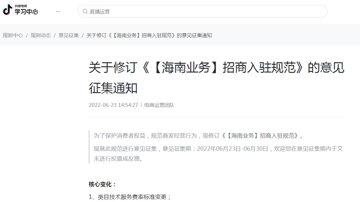 6月23日消息,今日,抖音电商发布关于修订《【海南业务】招商入驻规范》的意见征集通知,意见征集期为2022年6月23日-6月30日。该次修订的核心变化是修订后的类目技术服务费率标准发生变更。