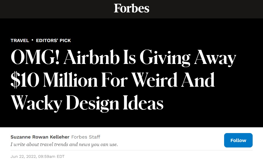 6月24日消息,据《福布斯》报道,爱彼迎(Airbnb)公司成立了一个规模为1000万美元的基金,以激励创建地球上“最古怪和最独特”的房产项目。