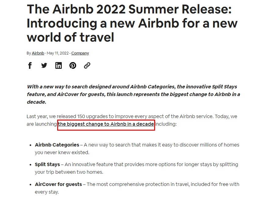 据了解,今年5月,Airbnb宣布将推出十年来最大的变化,包括:Airbnb类别(Airbnb Categories)、拆分住宿(Split Stays)、旅行保护(AirCover for guests)。