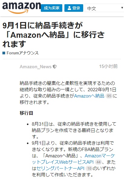 6月23日消息,亚马逊日本站今日发布公告,作为亚马逊正在进行的简化交付程序的一部分,从2022年9月1日起,传统的交付程序将被迁移到“Deliver to Amazon”中去。