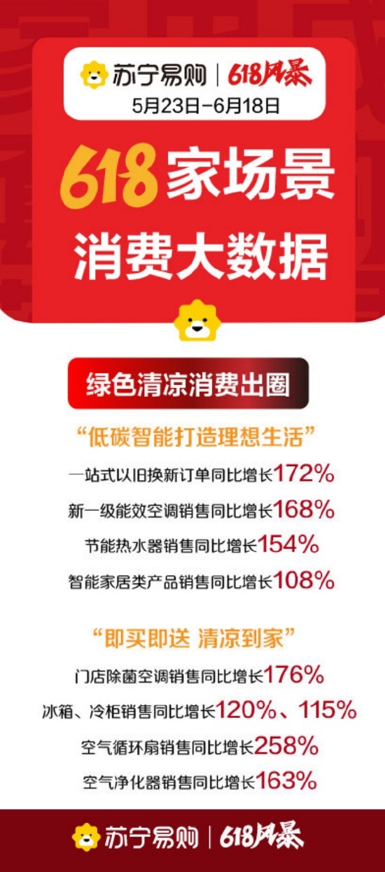 618期间,以旧换新成为苏宁易购门店“低碳消费”主流方式,订单同比增长172%,新一级能效空调销售同比增长168%,节能热水器销售同比增长154%,空调、冰箱、电视成为消费者最爱“焕新”的三大品类。同时,智能家居类商品需求旺盛,销售同比增长108%。