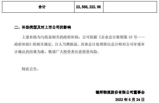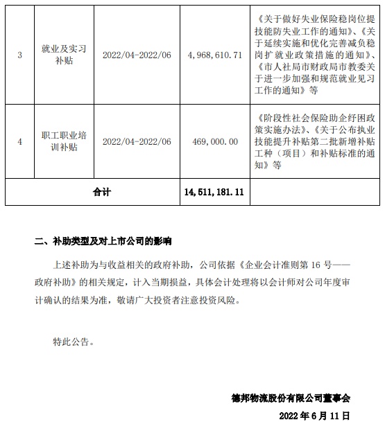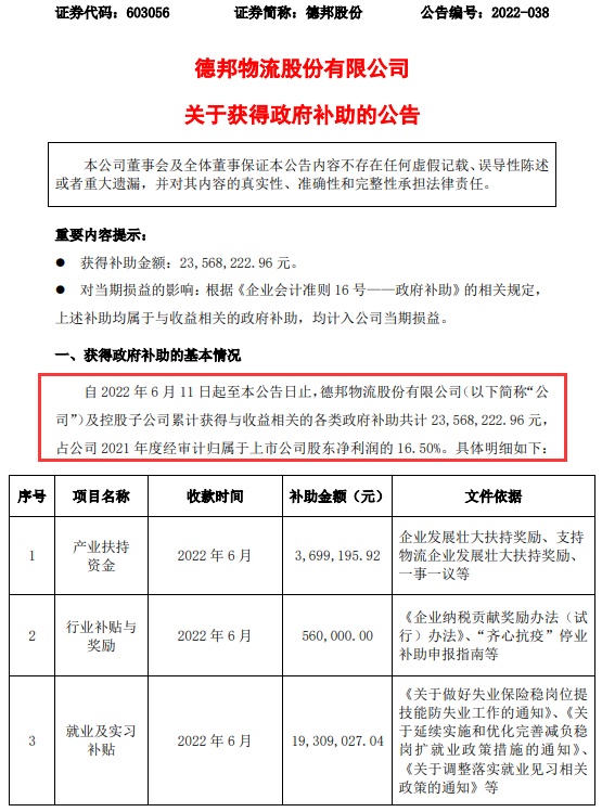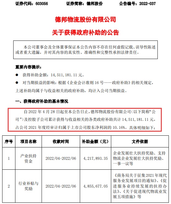 德邦股份还在6月11日发布关于获得政府补助的公告,自2022年4月28日起至本公告日止,公司及控股子公司累计获得与收益相关的各类政府补助共计14,511,181.11元,占公司2021年度经审计归属于上市公司股东净利润的10.16%。
