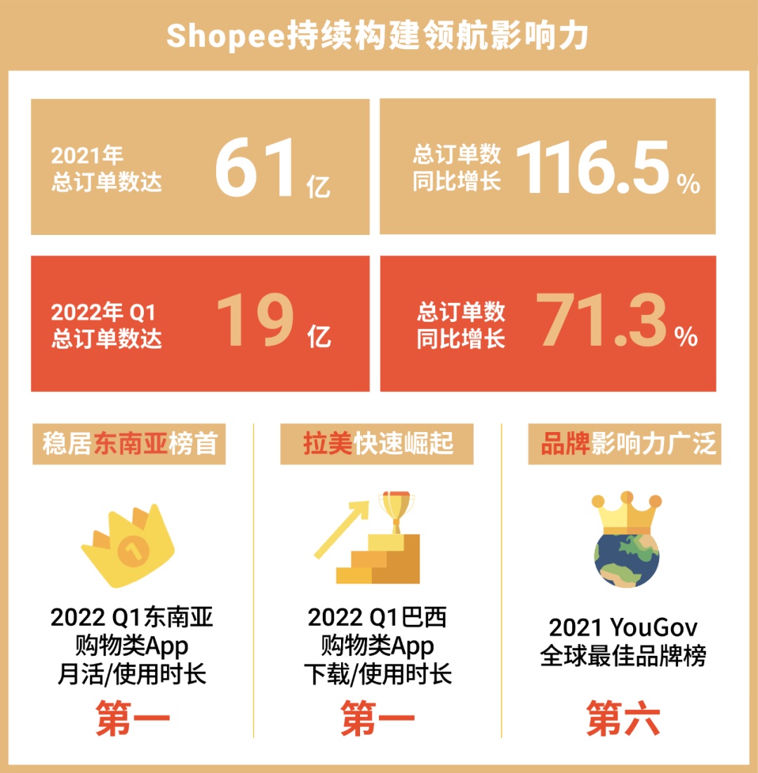 Shopee在2022年Q1全球购物类App总下载量排名第一,入驻的中国品牌在多个品类的大促榜单中名列前茅,还有小米、OPPO、realme等品牌跻身Shopee首批亿元美金俱乐部。2021年Shopee总订单数达到61亿,同比增长116.5%;2022年Q1总订单数达19亿,同比增长71.3%。