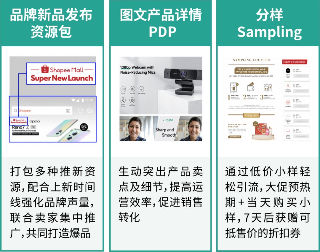 此外还有面向所有品牌推出的品牌卖家专属资源,包括Mall店申请资格、Brand Portal数据看板、Brand Day曝光资格、大促日Brand Package参与资格等等。同时Shopee不断丰富流量转化与品牌打造玩法,包括品牌新品发布资源包、图文产品详情PDP、分样Sampling等。