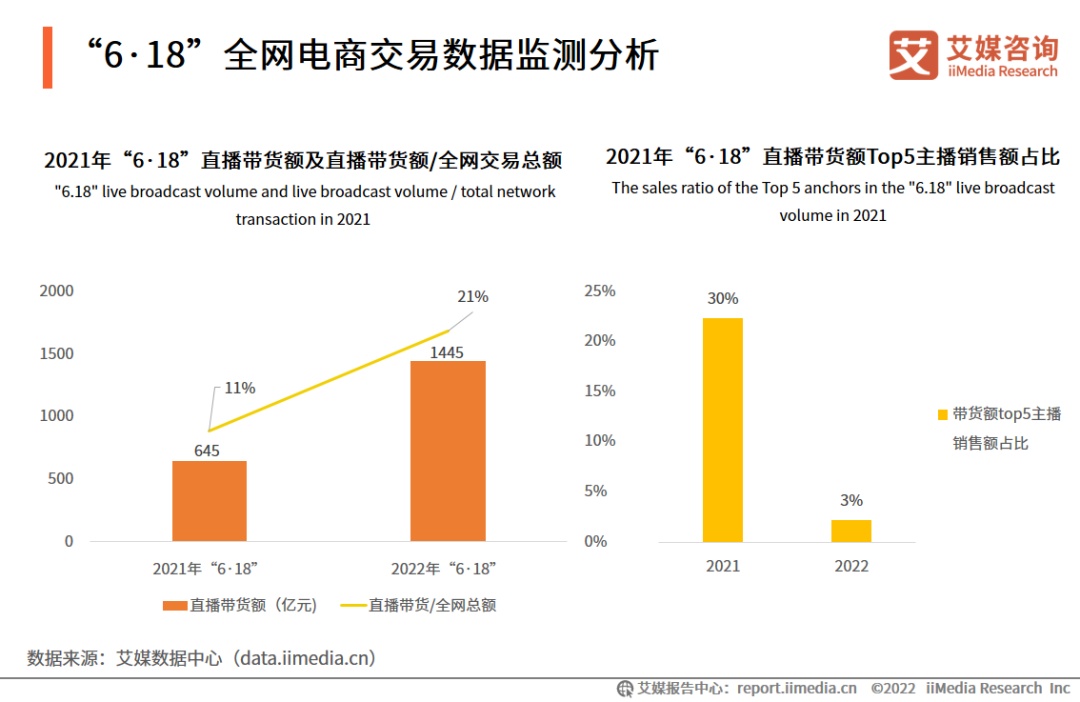 2021年“6·18”期间直播电商销售额达到1445亿元,同比增长124%,占全网销售总额的比例提升至21%。分平台看,本次直播电商销售额排名为抖音、快手和点淘。
