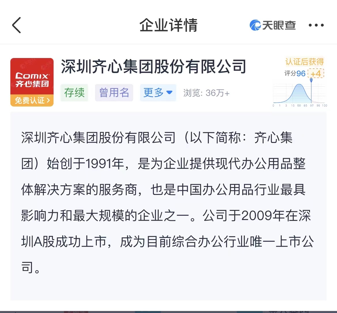天眼查资料显示,齐心集团始创于1991年,是为企业提供现代办公用品整体解决方案的服务商,也是中国办公用品行业最具影响力和最大规模的企业之一。公司于2009年在深圳A股成功上市,成为目前综合办公行业唯一上市公司。
