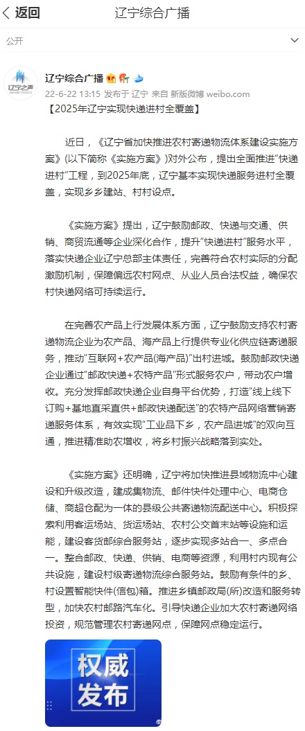 此外,《辽宁省加快推进农村寄递物流体系建设实施方案》(以下简称《实施方案》)近日对外公布,提出全面推进“快递进村”工程,到2025年底,辽宁基本实现快递服务进村全覆盖,实现乡乡建站、村村设点。