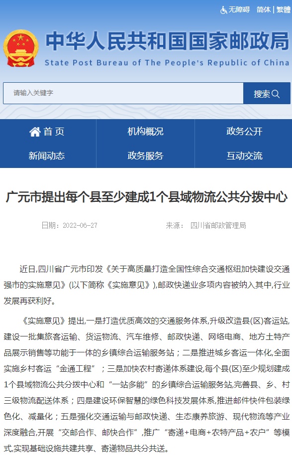 6月27日消息,近日,四川省广元市印发《关于高质量打造全国性综合交通枢纽加快建设交通强市的实施意见》(以下简称《实施意见》),邮政快递业多项内容被纳入其中。