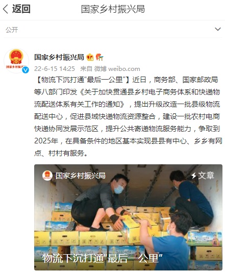 另据了解,近日,商务部、国家邮政局等八部门印发《关于加快贯通县乡村电子商务体系和快递物流配送体系有关工作的通知》,提出升级改造一批县级物流配送中心,促进县域快递物流资源整合,建设一批农村电商快递协同发展示范区,提升公共寄递物流服务能力,争取到2025年,在具备条件的地区基本实现县县有中心、乡乡有网点、村村有服务。