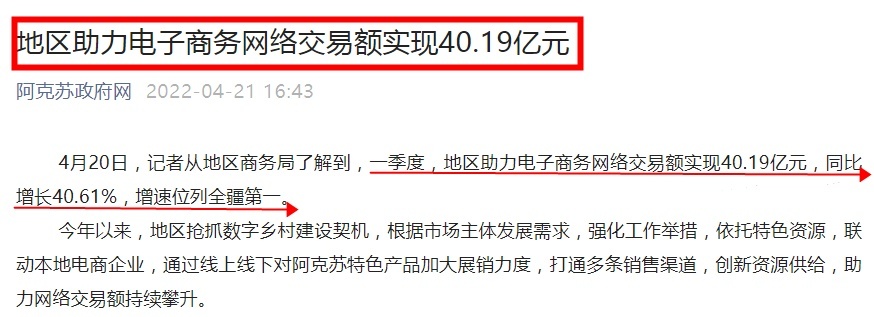 值得一提的是,此前,记者从地区商务局了解到,一季度,阿克苏地区助力电子商务网络交易额实现40.19亿元,同比增长40.61%,增速位列全疆第一。其中,该地通过与淘宝、京东等知名电商平台合作及“十城百店”工程推进“疆果东送”,实现网络零售额11.3亿元,同比增长64.54%,增速位居全疆第一,使地区坚果炒货、生鲜食材、“冰糖心”苹果、香梨等特色农副产品备受消费者关注。