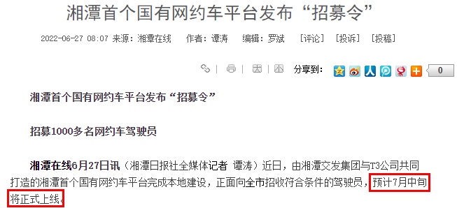 6月27日消息,近日,由湘潭交发集团与T3公司共同打造的湘潭首个国有网约车平台完成本地建设,正面向全市招收符合条件的驾驶员,预计7月中旬将正式上线。