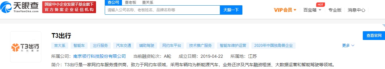天眼查信息显示,T3出行是一家网约车服务提供商,致力于网约车领域,采用车辆均为新能源汽车,业务还涉及汽车融资租赁、大数据运营和智能驾驶等领域。
