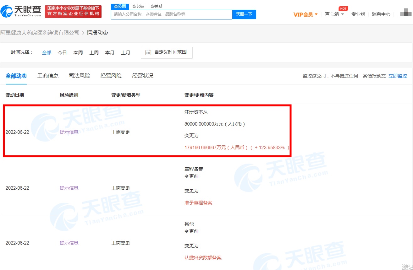 6月27日消息,天眼查信息显示,近日,阿里健康大药房医药连锁有限公司发生工商变更,注册资本由8亿人民币增至约17.9亿人民币,增幅约124%。