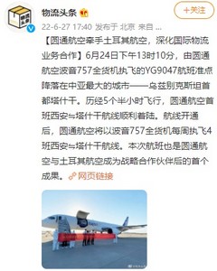6月27日消息,近日,由圆通航空波音757全货机执飞的YG9047航班准点降落在中亚最大的城市——乌兹别克斯坦首都塔什干。据悉,本次航班是圆通航空与土耳其航空成为战略合作伙伴后的首个成果。