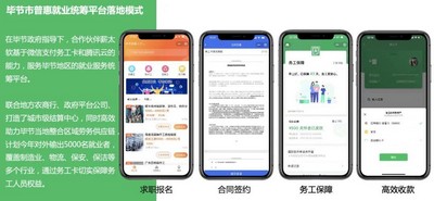 通过整合务工卡能力,毕节还上线了普惠就业统筹平台。当地居民不仅可通过平台找工作,还能实现从签约、就职,到打卡、收款到账、一键保障等务工全流程线上化。