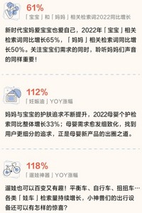 小红书数据显示,2022年“宝宝”相关检索词同比增长65%,“妈妈”相关检索词同比增长50%;2022母婴个护检索同比整体增长33%,其中妊娠油同比增长112%;遛娃的平衡车、自行车、扭扭车等各类“娃车”检索量持续增长;摇奶器同比增长1937%;大促前后“囤货”热度大增,其中奶粉、纸尿裤、辅食增长较快。