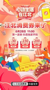 6月28日11点起,打开抖音App,搜索“江北消费券”或“心动生活在江北”,点击活动详情页,进入活动主会场即可参与抢券!