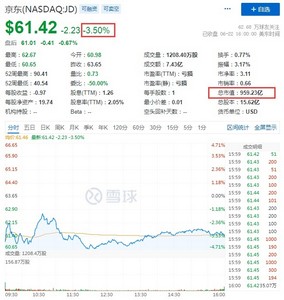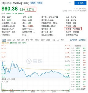 同时,每日优鲜跌超6%,百世集团跌近5%,拼多多、寺库跌超4%,拼多多报60.36美元,总市值763.18亿美元,京东跌超3%,报61.42美元,总市值959.23亿美元,阿里巴巴、携程、唯品会、BOSS直聘跌超1%,阿里巴巴报105.15美元,总市值2850.53亿美元,唯品会报10.63美元,总市值69.74亿美元。