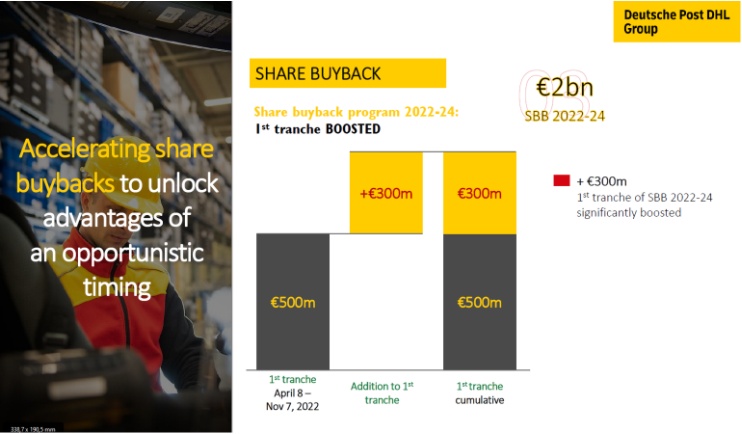近日,DHL集团宣布将加快执行其运行中的股票回购计划。集团打算在2022年11月7日之前进行高达8亿欧元的股票回购,在目前运行的5亿欧元的部分基础上再启动高达3亿欧元的额外金额。这些计划是2022年3月宣布的总金额高达20亿欧元的2022-24年股票回购计划的一部分,该计划最迟将执行至2024年12月。