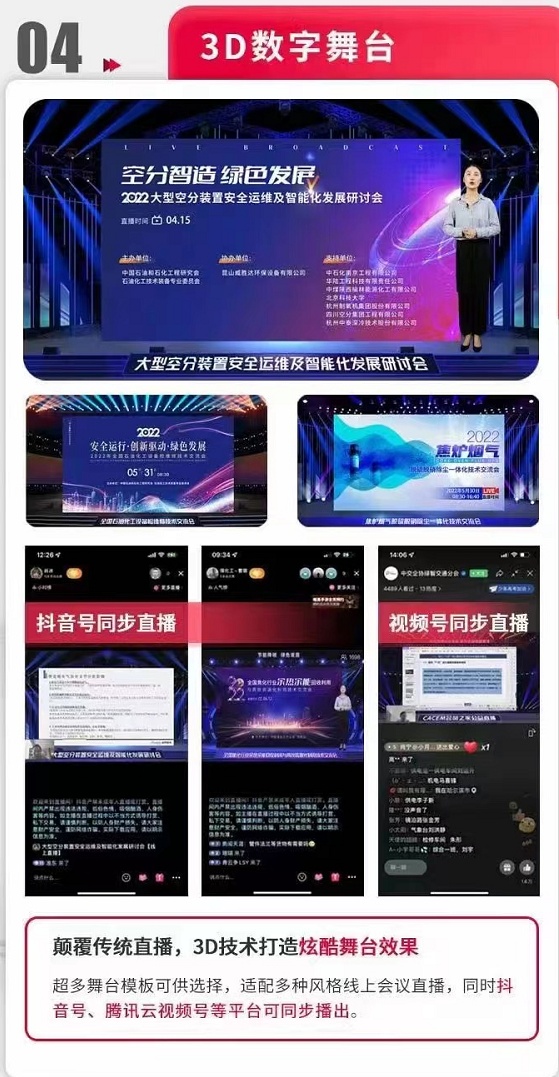 最后是3D数字舞台升级,适配多种风格线上会议直播,同时抖音号、腾讯云视频号等平台可同步播出;嵌入式视觉升级,集成演示文稿、音视频文件、共享桌面等功能于一体的全新会议模式。