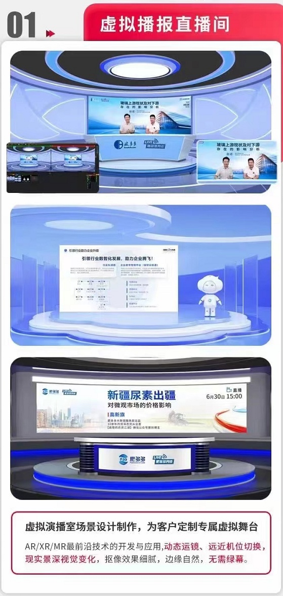 据介绍,通过技术创新,国联云3D虚拟仿真直播间升级,通过虚拟演播室场景设计制作,为客户定制专属虚拟舞台。AR/XR/MR最前沿技术的开发与应用,可以动态运镜、远近机位切换,现实景深视觉变化,且无需绿幕。