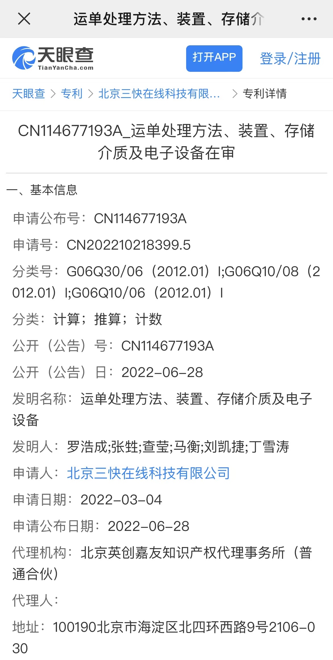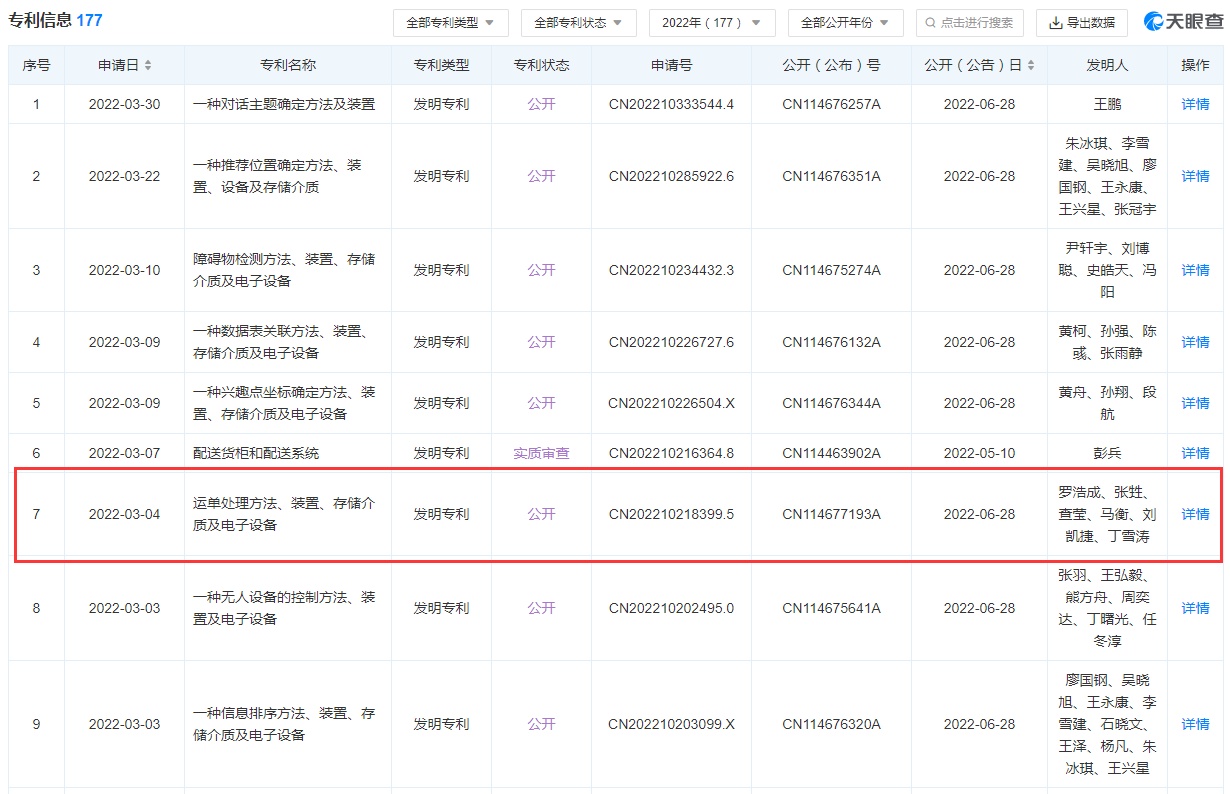 6月29日消息,天眼查资料显示,美团关联公司北京三快在线科技有限公司6月28日公开一项“运单处理方法、装置、存储介质及电子设备”专利,申请公布号为CN114677193A,申请日期为2022年3月4日。