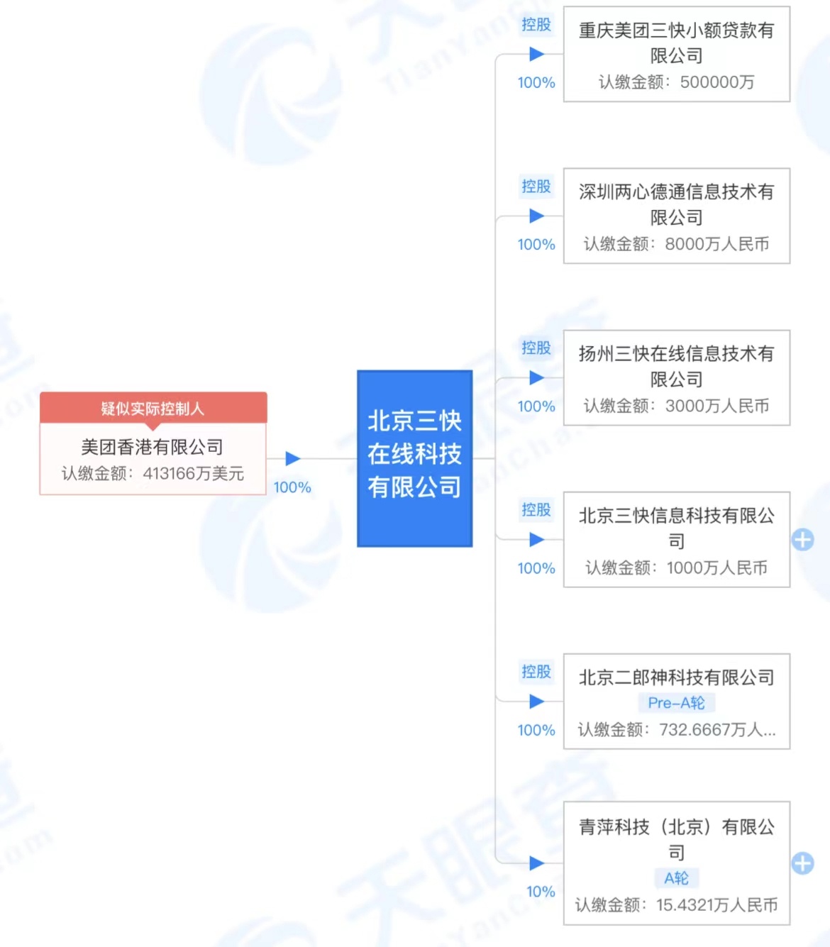 股权穿透图显示,北京三快在线科技有限公司由美团香港有限公司100%全资持股,认缴金额为413166万美元。