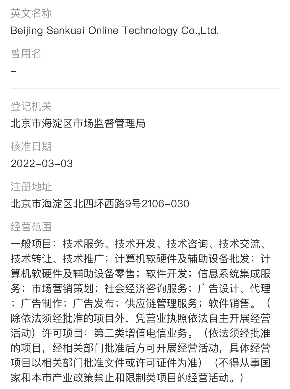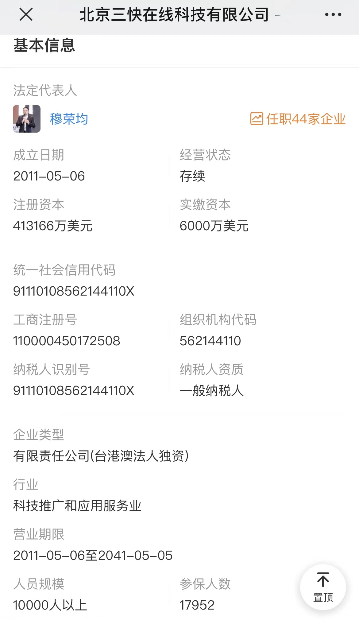 天眼查资料显示,北京三快在线科技有限公司成立于2011年5月,注册资本413166万美元,法定代表人为穆荣均,公司经营范围包括计算机软件技术、网络技术开发;技术转让、技术服务、技术咨询;计算机系统集成;企业营销策划;经济贸易咨询;销售自行开发的软件产品;批发计算机硬件及其配套设备;基础软件服务;应用软件服务;设计、制作、代理、发布广告;供应链管理。
