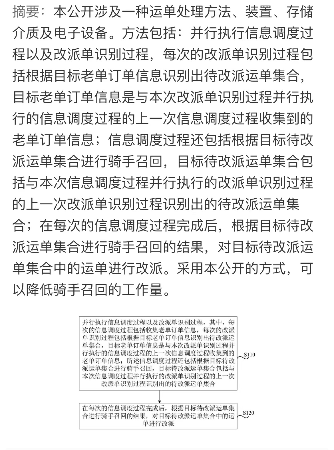 该专利摘要显示,本公开涉及一种运单处理方法、装置、存储介质及电子设备。方法包括:并行执行信息调度过程以及改派单识别过程,每次的改派单识别过程包括根据目标老单订单信息识别出待改派运单集合,目标老单订单信息是与本次改派单识别过程并行执行的信息调度过程的上一次信息调度过程收集到的老单订单信息;信息调度过程还包括根据目标待改派运单集合进行骑手召回,目标待改派运单集合包括与本次信息调度过程并行执行的改派单识别过程的上一次改派单识别过程识别出的待改派运单集合;在每次的信息调度过程完成后,根据目标待改派运单集合进行骑手召回的结果,对目标待改派运单集合中的运单进行改派。采用本公开的方式,可以降低骑手召回的工作量。
