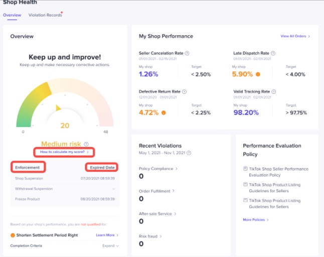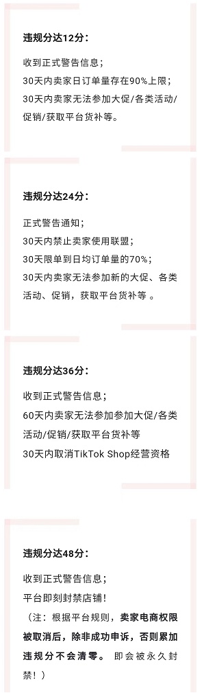 据悉,针对卖家不同的违规行为,TikTok Shop平台设置了违规分和节点处罚体系。违规分指平台向违规卖家所累加的违规积分。平台根据卖家违规严重程度及其影响范围,对卖家账户累加相应违规分。 违规分的有效期为180天,180天后违规分自动失效。若卖家严重违规,违规分累计达到48分,TikTok Shop将取消卖家平台经营权。