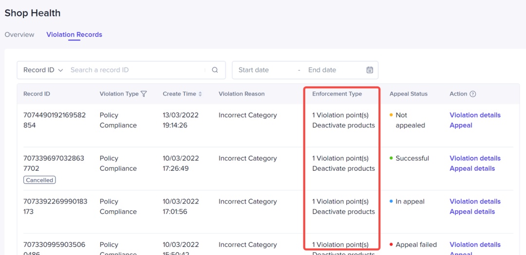 如有违规情况发生,违规记录(Violation records)页面也会更新违规提示。