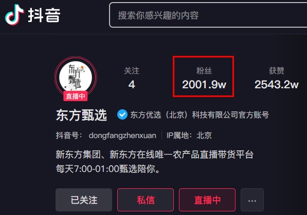 6月29日消息,近期,以董宇辉为代表的“东方甄选”主播以“双语带货”模式直接带火了新东方直播间。抖音数据显示,今日上午,新东方在线旗下“东方甄选”直播间的粉丝总量正式突破2000万大关。