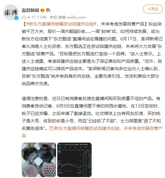 本月早些时候,东方甄选被曝正在尝试自建供应链,未来将大力发展“东方甄选”自营产品。“目标是把东方甄选打造成一个品牌。”该人士表示。上述人士透露,考虑自建供应链主要是为了保证售后和产品质量。“另外,自建供应链确实可以降低产品成本。”