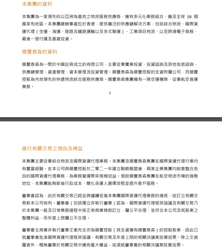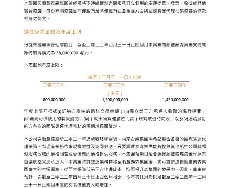 根据未经审核管理层账目,截至2022年4月30日止四个月,嘉里物流向顺丰泰森集团支付或应付的总额约为2800万港元。2022年度上限为8亿港元,2023年度上限为13亿港元,2024年度上限为14.3亿港元。