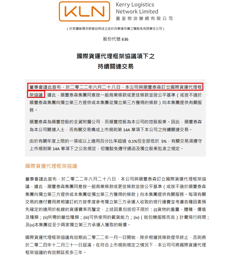 嘉里物流宣布,于2022年6月28日,公司与顺丰泰森订立国际货运代理框架协议,据此,顺丰泰森集团同意按一般商业条款或更佳条款并按公平基准(或按不逊于顺丰泰森集团向独立第三方提供或本集团从独立第三方获得的条款)向集团提供有关服务。顺丰泰森为顺丰控股的全资附属公司,而顺丰控股为公司的控股股东。因此,顺丰泰森为嘉里物流关连人士。