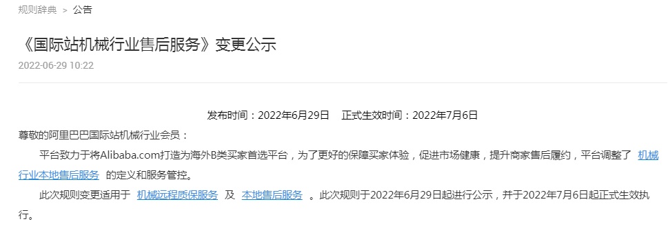 阿里国际站调整机械行业售后服务定义和服务管控