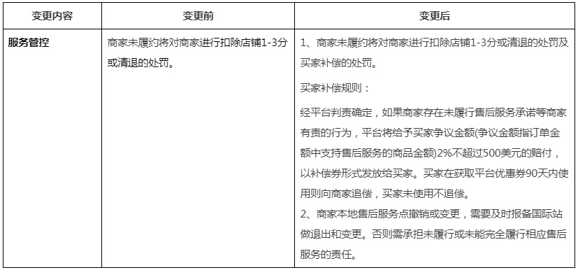 据悉,服务管控变更前,商家未履约将对商家进行扣除店铺1-3分或清退的处罚。变更后,商家未履约将对商家进行扣除店铺1-3分或清退的处罚及买家补偿的处罚。买家补偿规则上,经平台判责确定,如果商家存在未履行售后服务承诺等商家有责的行为,平台将给予买家争议金额(争议金额指订单金额中支持售后服务的商品金额)2%不超过500美元的赔付,以补偿券形式发放给买家。买家在获取平台优惠券90天内使用则向商家追偿,买家未使用不追偿。