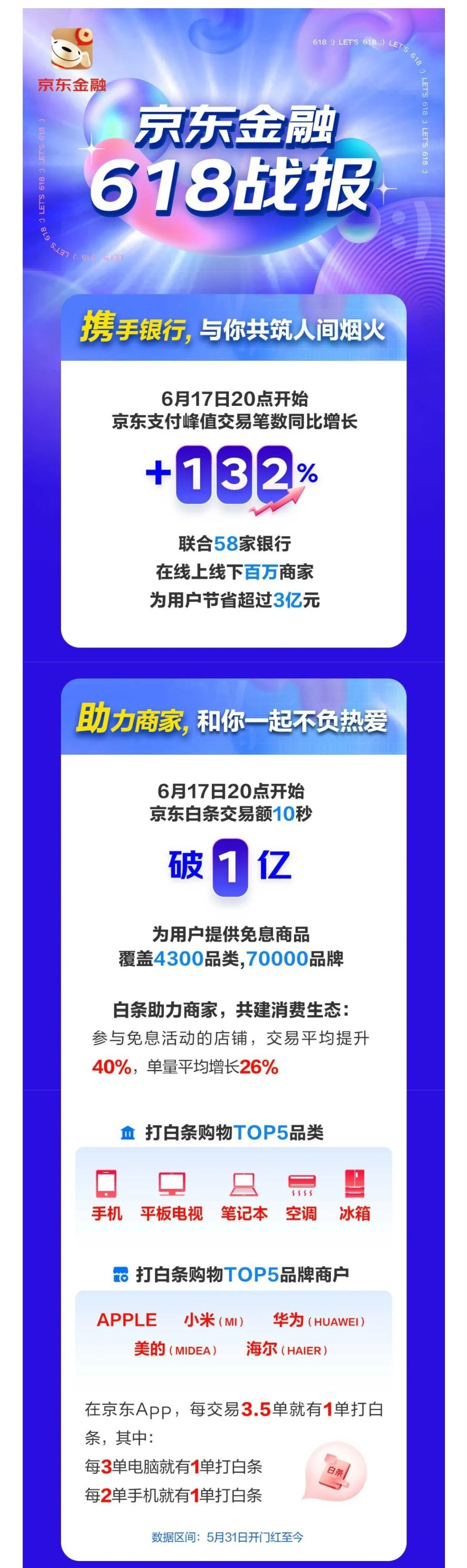 值得一提的是,京东金融618战报显示,6月17日20点开始,京东支付峰值交易笔数同比增长超132%,联合58家银行、在线上线下百万商家,为用户节省超过3亿元。