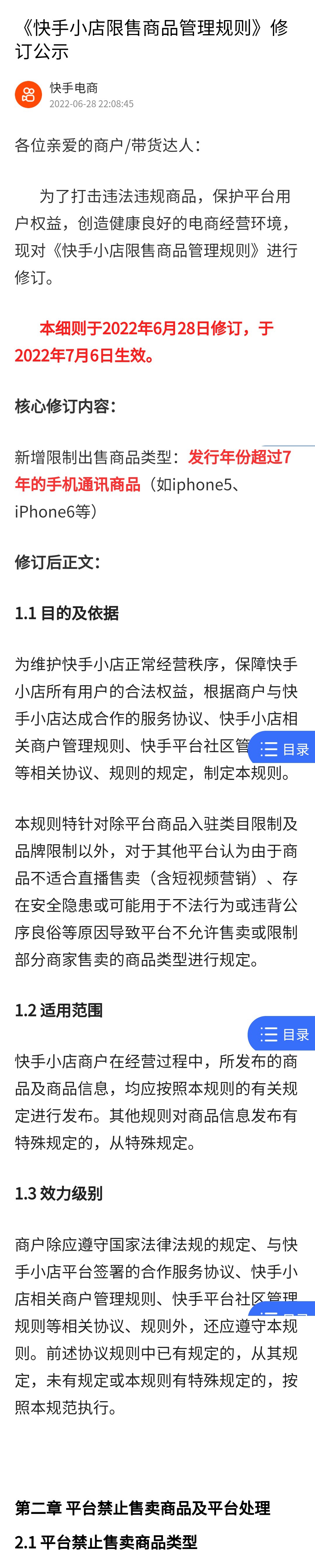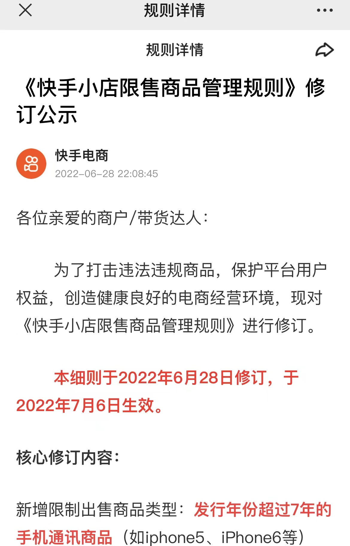 公告称,为了打击违法违规商品,保护平台用户权益,创造健康良好的电商经营环境,现对《快手小店限售商品管理规则》进行修订。本细则于2022年6月28日修订,于2022年7月6日生效。