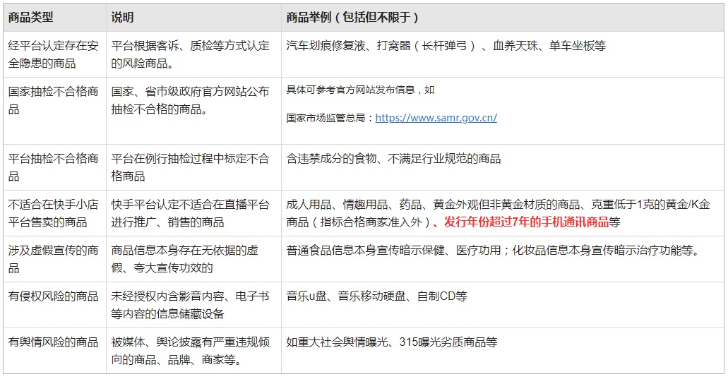《快手小店限售商品管理规则》显示,本规则特针对除平台商品入驻类目限制及品牌限制以外,对于其他平台认为由于商品不适合直播售卖(含短视频营销)、存在安全隐患或可能用于不法行为或违背公序良俗等原因导致平台不允许售卖或限制部分商家售卖的商品类型进行规定。