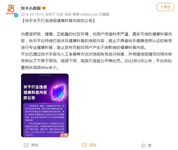 快手打击违规健康科普内容 5月以来处置相关视频超40万个
