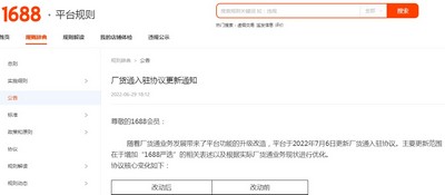 6月30日消息,1688平台日前发布厂货通入驻协议更新通知(以下简称公告)。