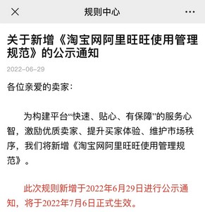 公告称,为构建平台“快速、贴心、有保障”的服务心智,激励优质卖家、提升买家体验、维护市场秩序,淘宝网将新增《淘宝网阿里旺旺使用管理规范》。此次规则新增于2022年6月29日进行公示通知,将于2022年7月6日正式生效。淘宝网将在2022年8月份、9月份对上一考核周期不达标的卖家做营商保预警,从10月份起对上一考核周期不达标的卖家进行公示警告,特别严重的卖家扣A类4分。从2023年2月份起,将对上一考核周期不达标的卖家扣A类4分。