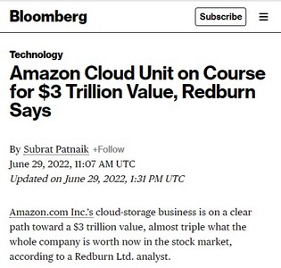 6月30日消息,投行Redburn分析师亚历克斯·海塞尔(Alex Haissl)今日在一份研究报告中称,亚马逊的云存储业务有望达到3万亿美元的估值,几乎是整个亚马逊当前市值的三倍。