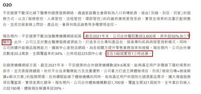 截至2021年12月31日,平安健康已与超过3600家医院建立合作,其中50%以上为三甲医院;合作药店数达20.2万家,全国覆盖率约34%;布局超225个中心仓,并在140城实现一小时内送药到家;已签约超过1100名外部名医,内外部医生团队及健康师、营养师和心理咨询师超4.8万名。