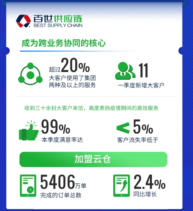 今年一季度,百世供应链持续拓展云仓网络,发展优质客户,并开始服务汽配、医药行业客户。整个季度,供应链新增11个大客户,加盟云仓完成的订单总数增长2.4%至5406万单。